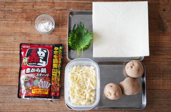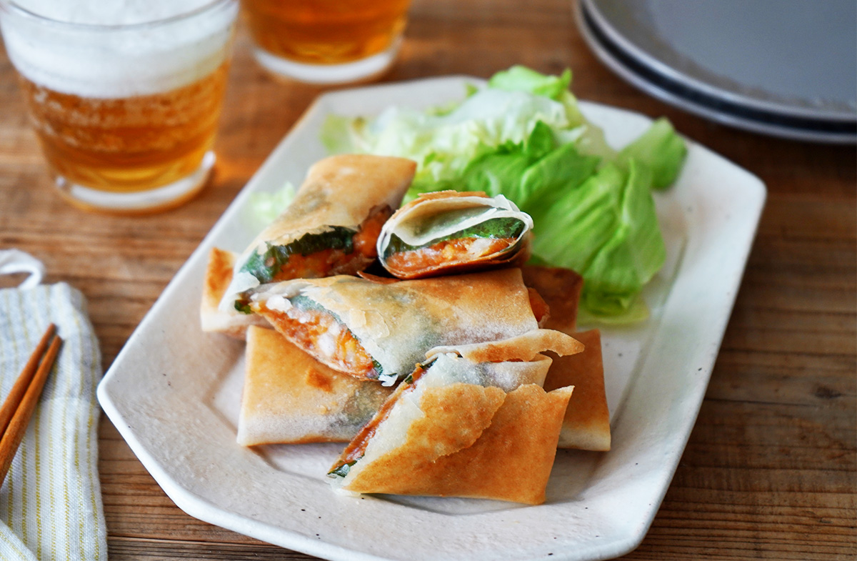 淡泊な味のじゃがいもに赤からスティックをしっかり混ぜて、程よい辛さと旨みをプラス。春巻きの皮でカラっと香ばしく揚げ焼きにすると、おつまみに最高な1品に。辛すぎないので、子どもも一緒に食べられます。