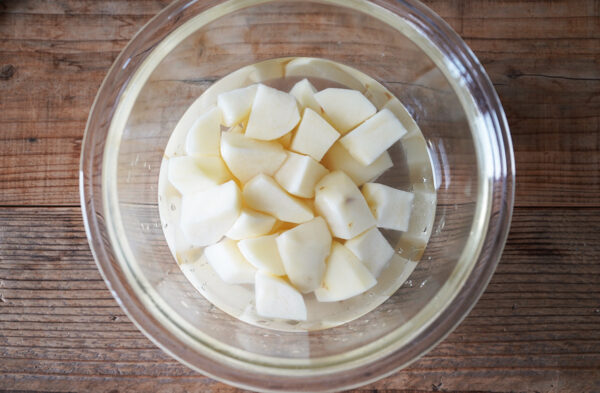 じゃがいもは皮をむいて一口大に切り、10分水にさらす。水気を切って、ふんわりラップをかけ、電子レンジ(600W)で5分を目安に、全体がやわらかくなるまで加熱する。