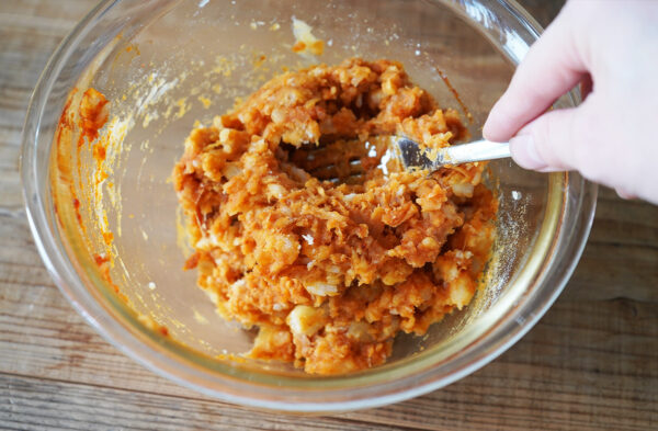 (1)をフォークなどで潰し、Aを混ぜ、6等分にする。