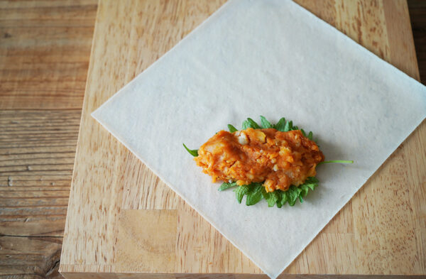 春巻きの皮を斜めに置く。手前に大葉を敷き、(2)をのせる。