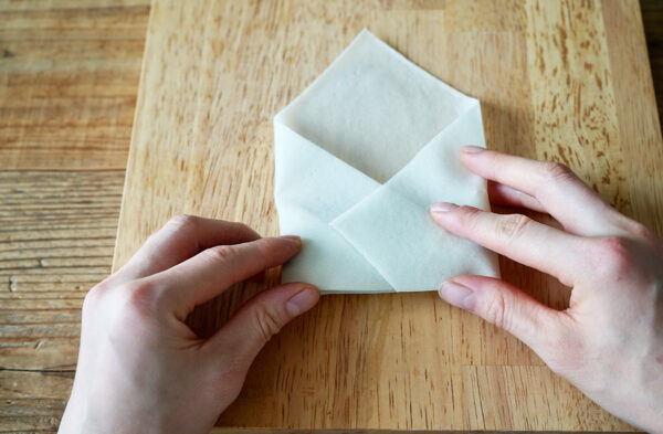 春巻きを手前からひと巻きし、両端を内側に折り込み、もうひと巻きして、Bの水溶き薄力粉を端に塗ってとめる。