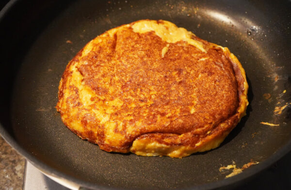 生地が固まってきたらひっくり返す。(フライパンより一回り小さい皿を生地に被せ、フライパンごとひっくり返し、滑り込ませるようにして戻しても良い。)