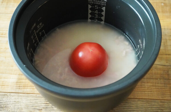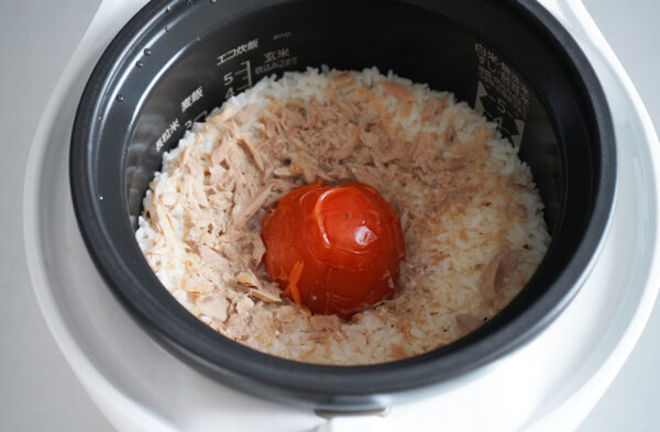 (2)に塩糀、水気を切ったツナ、水を入れて軽く混ぜ、トマトを真ん中にのせて通常モードで炊飯する。
