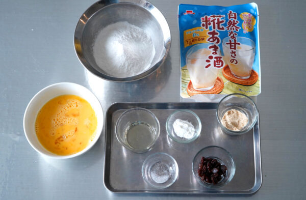 ボウルに米粉、きび砂糖、塩、ベーキングパウダーを入れ、スプーンなどでよく混ぜる。
