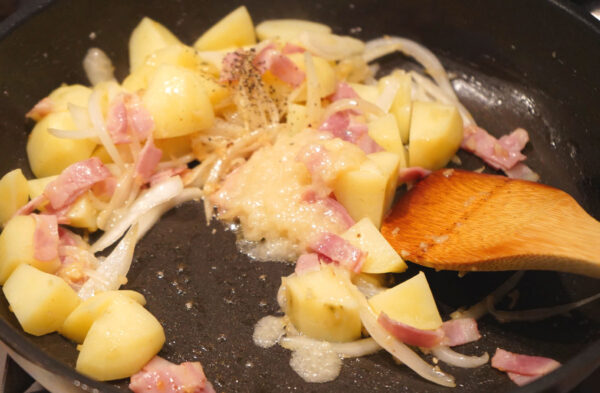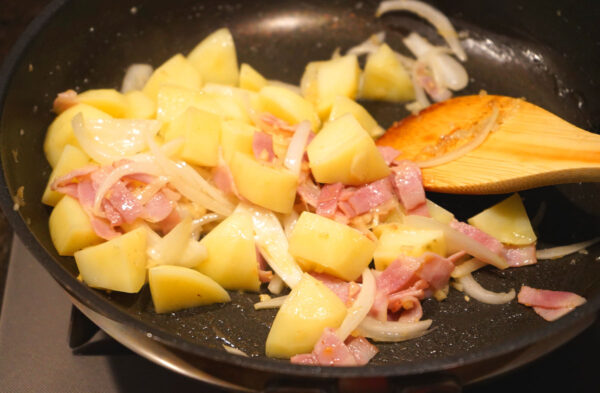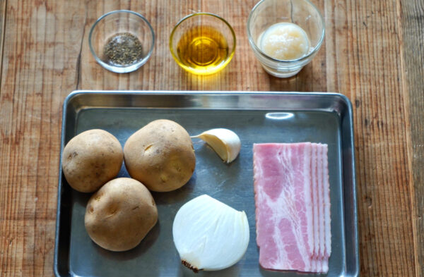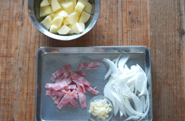 じゃがいもは一口大に切り10分程水にさらす。ベーコンは1cm幅に切る。玉ねぎは薄切り、にんにくはみじん切りにする。