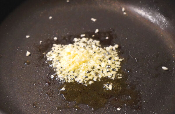 フライパンにオリーブオイルとにんにくを入れて中火で熱し、香りが出てきたらベーコン、玉ねぎを入れて炒め合わせる。