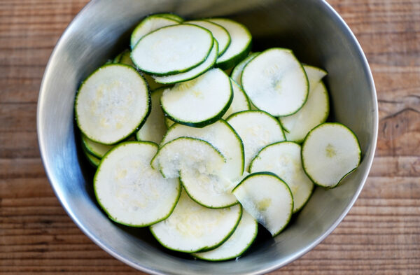 ズッキーニは薄切りにして塩でもみ、10分置いて水気を切る。