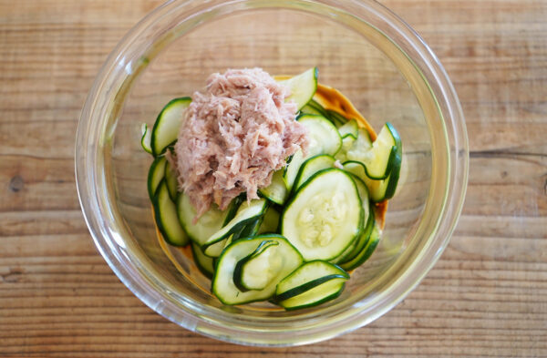 ズッキーニとツナ缶(オイルごと)を加えて和える。