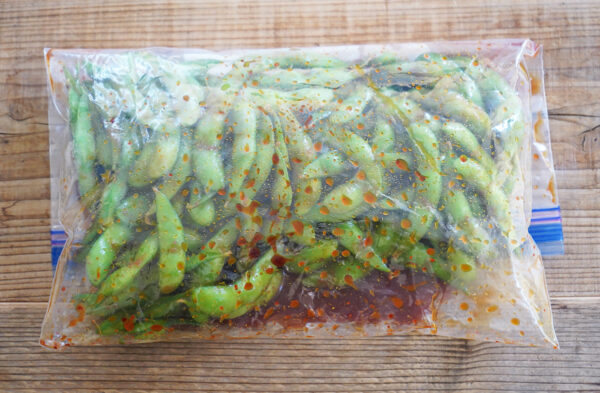 (1)に冷凍枝豆を凍ったまま入れて、全体になじませる。