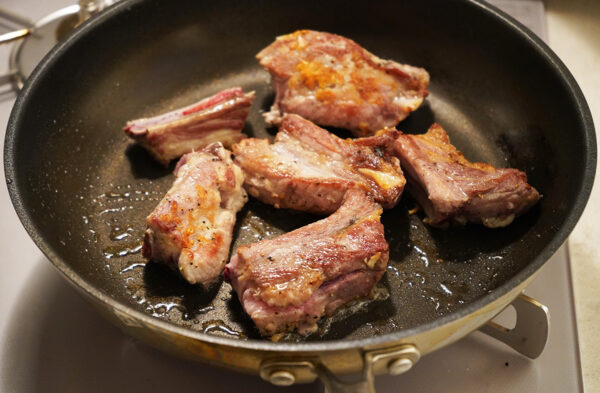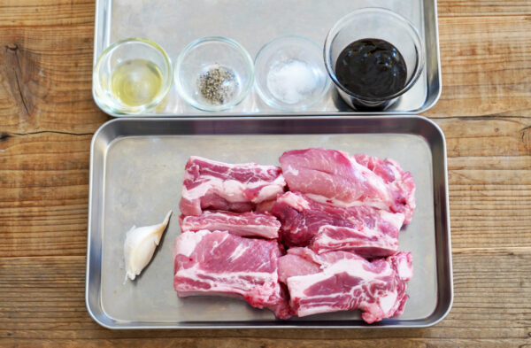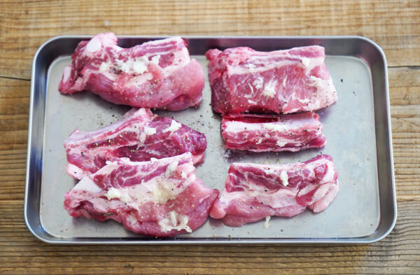 スペアリブの両面に、塩、黒こしょう、にんにくをなじませる。