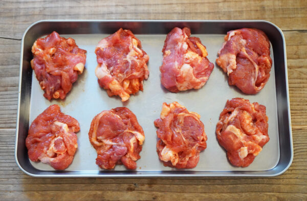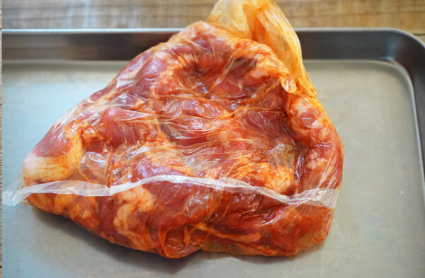 ポリ袋に豚肉と赤から焼のたれを入れてなじませ、15分置く。
