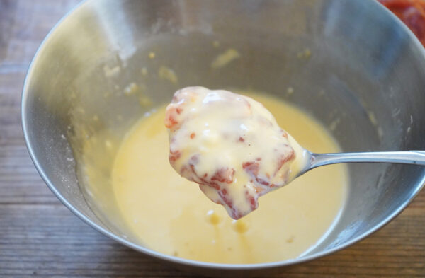 豚肉はぎゅっと握るようにまとめると、衣を絡めるときに崩れにくくなります。
