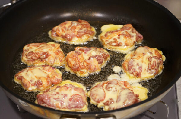 フライパンに油を深さ5mm程度まで入れ、中火で熱し、(3)を入れて両面に焼き色がつくまで揚げ焼きにする。