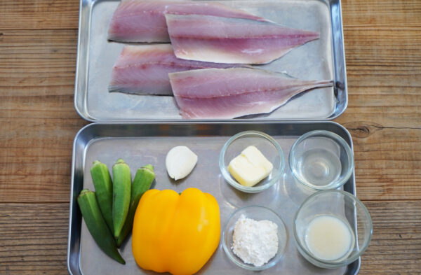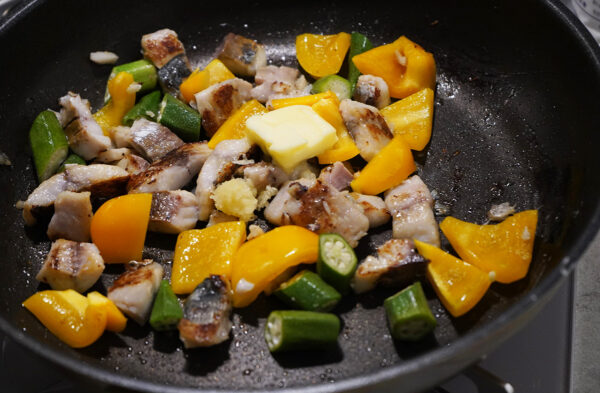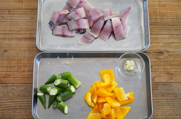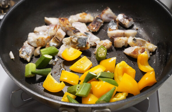 フライパンに油を熱し、アジを重ならないように並べ、両面にこんがりと焼き色がつくまで焼く。端にオクラとパプリカを入れて炒める。