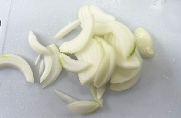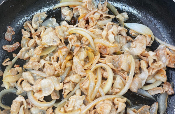 フライパンを熱し、豚肉と玉ねぎを軽く炒め、献立いろいろつゆを加えて、玉ねぎがしんなりするまで炒める。