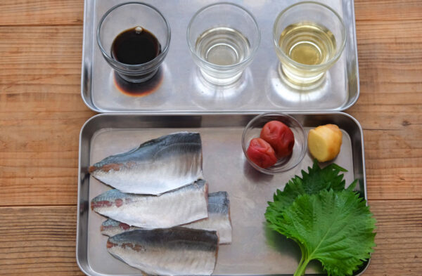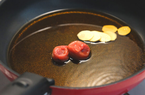 フライパンに水、A、輪切りにしたしょうが、軽く潰した梅干しを入れ加熱する。