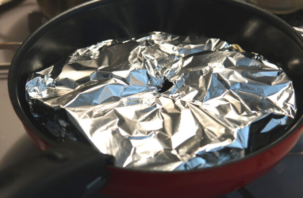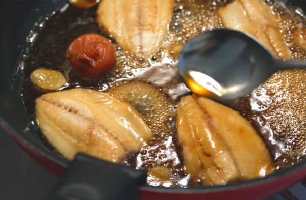 煮立ったら、アジを皮目を下にして入れ、弱火で2分加熱する。ひっくり返し落とし蓋をして弱火で10分煮る。