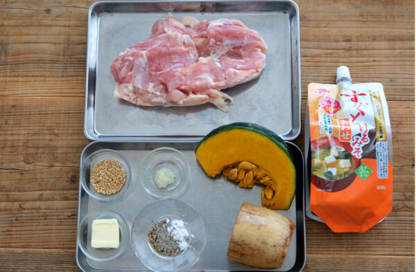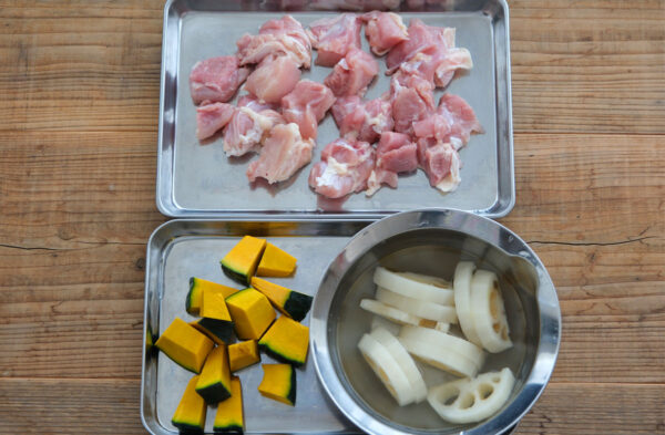 れんこんは厚さ7mmの半月切り、かぼちゃは2〜3cm角に切る。鶏肉は一口大に切る。