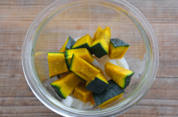 耐熱容器にれんこんとかぼちゃを入れてふんわりとラップをかけ、電子レンジ(600W)で5分加熱する。