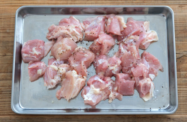 鶏肉に塩、黒こしょう、にんにく(チューブ)をなじませ、バターを熱したフライパンで鶏肉を炒める。