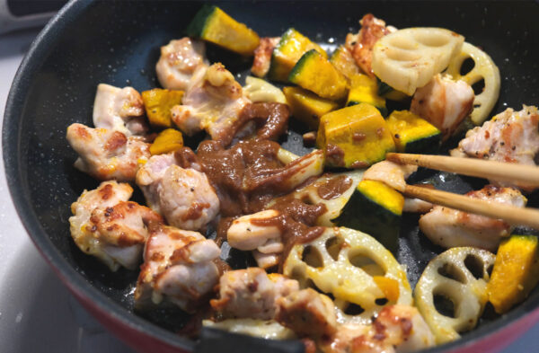 鶏肉に焼き色がついたられんこん、かぼちゃを加え、さらに3分炒める。
