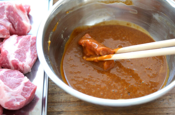 ボウルにAを混ぜ合わせ、一口大に切った豚肉を入れて絡める。