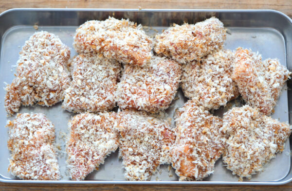パン粉と粉チーズを混ぜ合わせた衣を(1)につける。