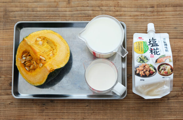 デコレーションが苦手な方でも挑戦しやすいハロウィンレシピ。ほんの一工夫で、スープがハロウィンを盛り上げてくれる一品に。塩糀がかぼちゃ本来の甘みを引き立て、甘過ぎずすっきりとした味わいになります。
