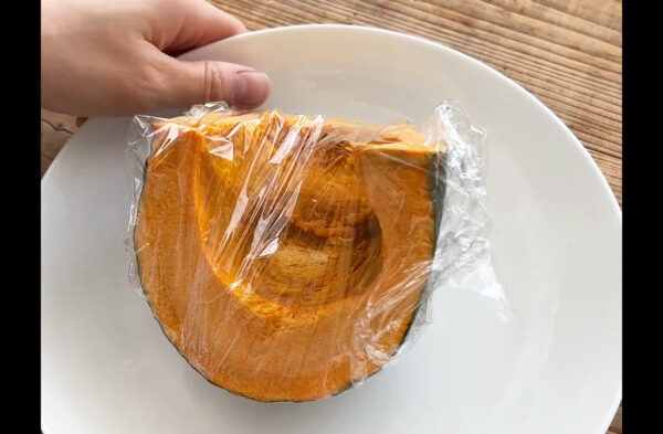 かぼちゃはスプーンで種とワタを取り、耐熱容器に入れてふんわりとラップをかけ、電子レンジ(600W)で8分加熱する。
