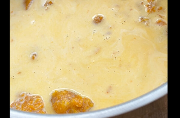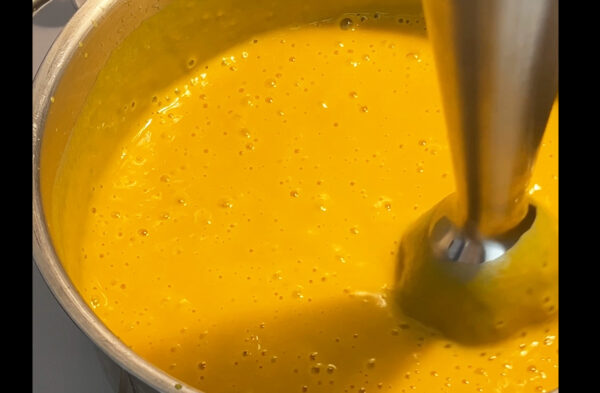 (2)に牛乳、塩糀を加え、ハンドブレンダーで滑らかになるまで攪拌する。(ハンドブレンダーを使わない場合は、裏ごし器でこすかフォークなどでしっかりと潰して混ぜ合わせる。)