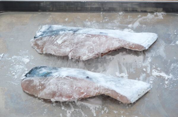サワラに塩をふり、水分を拭き取り、片栗粉をまぶす。