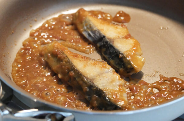 サワラに片栗粉をまぶすと、たれがしっかりと絡みます。