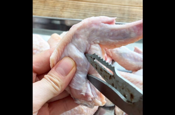 手羽先はよく洗って水気を切り、皮目を下にして骨と骨の間にはさみで切り込みを入れる。