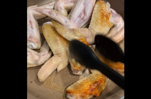 フライパンに油を熱し、手羽先を皮目が下になるように並べ、きれいな焼き色がつくまで焼く。ひっくり返してさらに3分焼く。