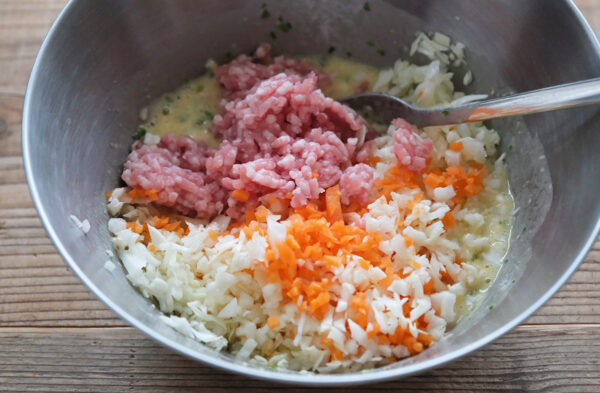 (1)と豚挽き肉を入れてさらに混ぜる。