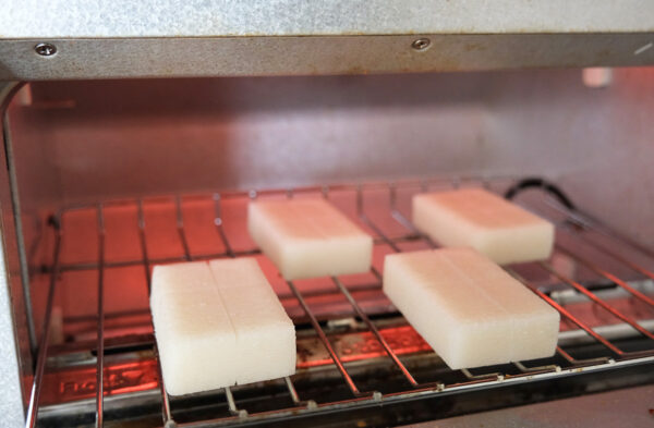 オーブントースターに切り餅を入れて5分加熱し、一度取り出す。