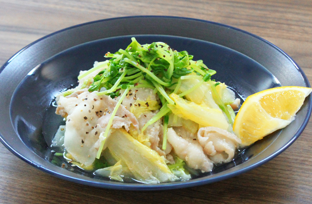 フライパンひとつで、豚肉の旨みを白菜にまとわせながら、熱々に蒸し上げます。仕上げのレモン果汁と黒こしょうがポイントです。