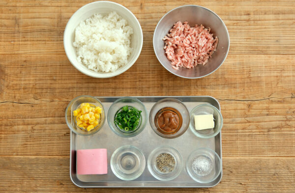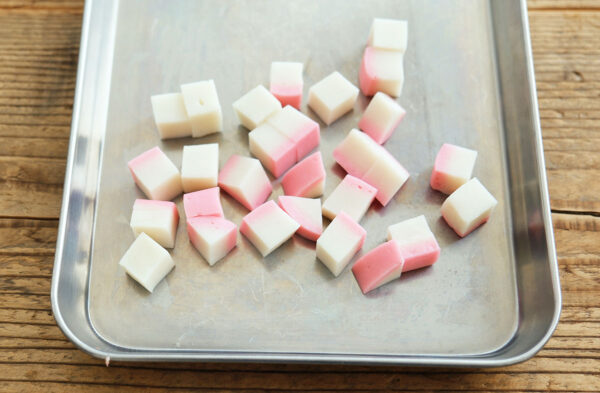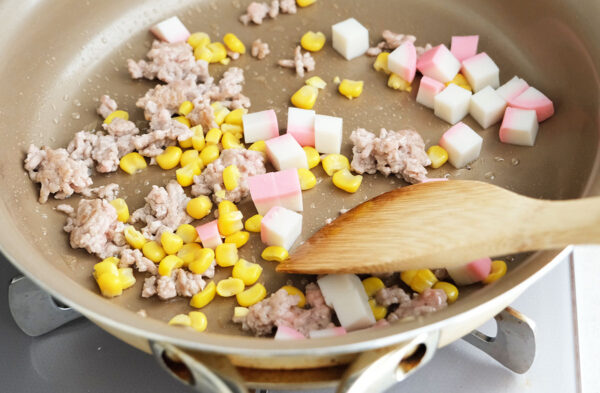 かまぼこは1cm角に切る。スイートコーンは水気をきる。