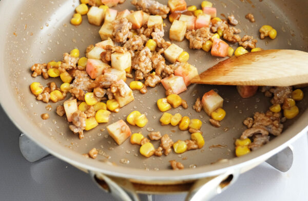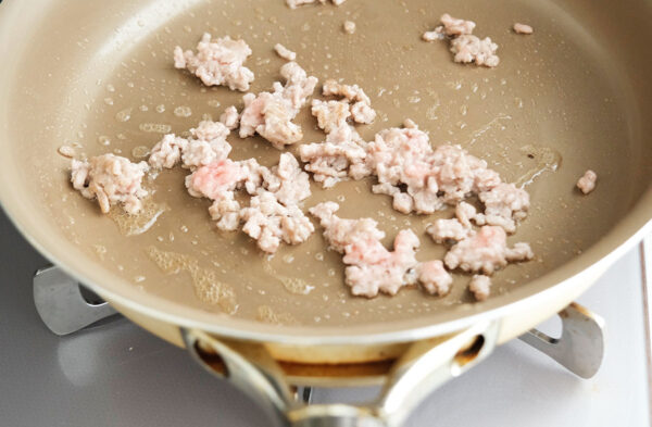 フライパンに油を熱し、豚ひき肉を入れて表面が白っぽくなるまで炒める。