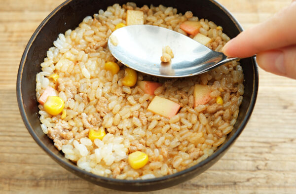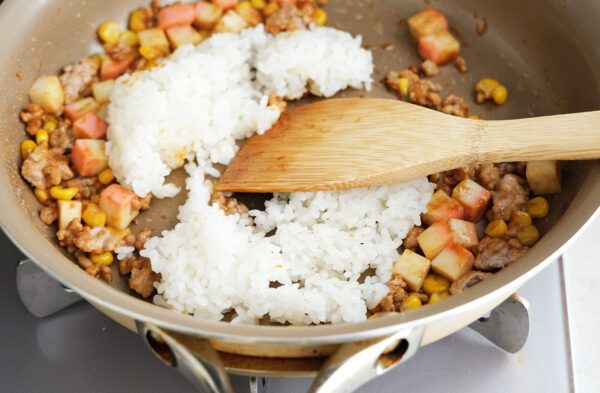 (4)にご飯を入れて炒め、塩を加えて味を調える。