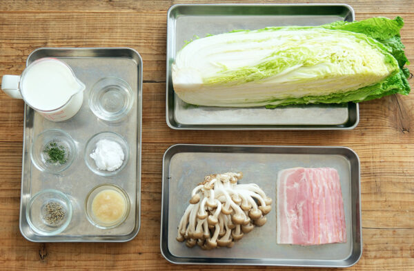 白菜は芯と葉に分ける。芯は1.5cm幅の斜め切りにし、葉は食べやすい大きさに切る。しめじは石づきを取ってバラバラにする。ベーコンは7mm幅に切る。