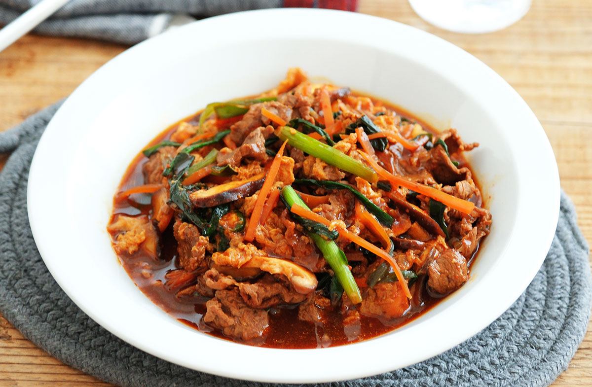 フライパンにごま油を熱し、牛肉を入れて炒める。色が変わってきたら(1)を入れてさらに1分炒める。