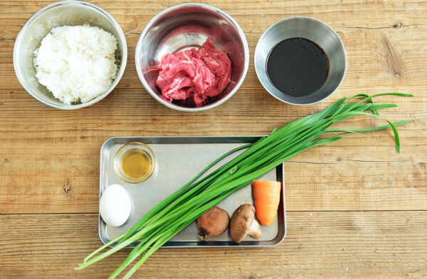 にんじんは細切りにし、ニラは幅4cmに切る。しいたけの傘は薄切りにし、軸は根元を切り落として手でさく。牛肉は食べやすい大きさに切る。