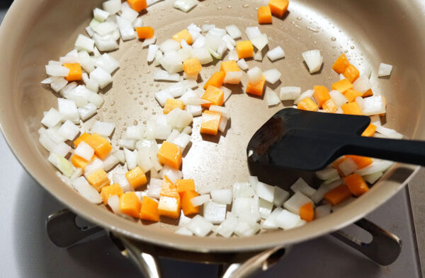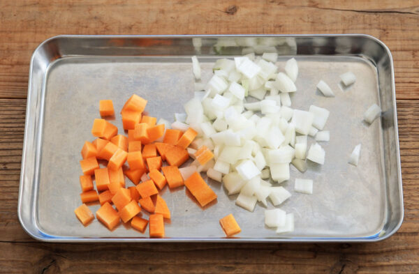 玉ねぎ、にんじんは1cm角に切る。