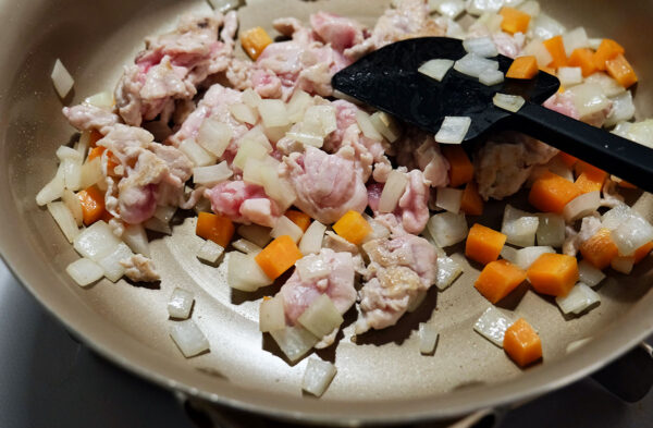 玉ねぎが透き通ってきたら豚肉を入れ、豚肉の色が変わるまで炒める。