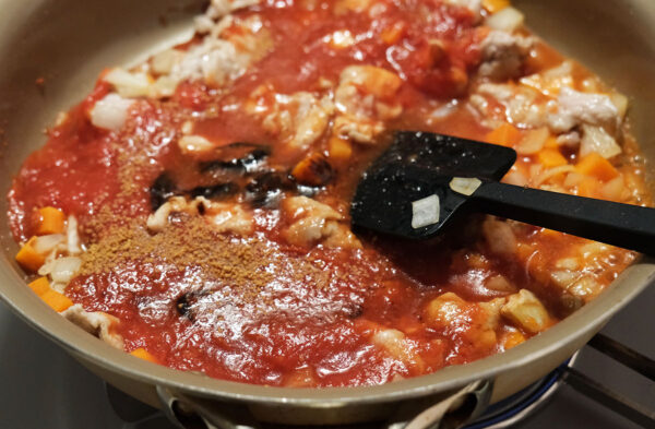 (3)にAを加えて混ぜ、煮立ったらフタをして弱火で10分煮る。