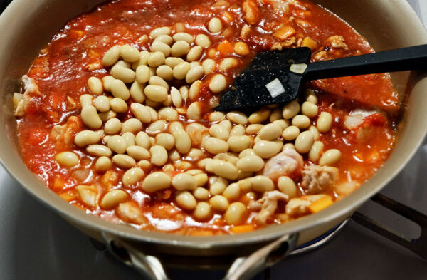 水煮大豆を入れてさらに5分煮る。塩を入れて味を調える。