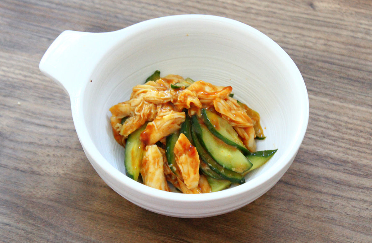 ササミときゅうりの和え物を、献立いろいろ梅みそでさっぱりコク旨に味付けします、ササミは塩糀で漬けることで、ふっくらやわらかく仕上がります。