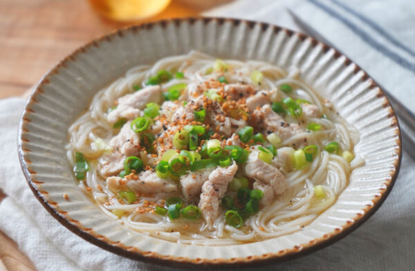 鶏肉を電子レンジ(600W)で2分を目安に、中心に火が通るまで加熱する。ラップをかけたまま粗熱を取り、煮汁の中で細かくほぐす。