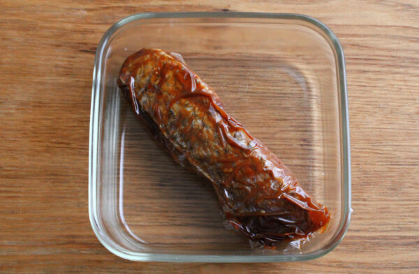 ラップでぴったりと包んで、一晩冷蔵庫で漬ける。